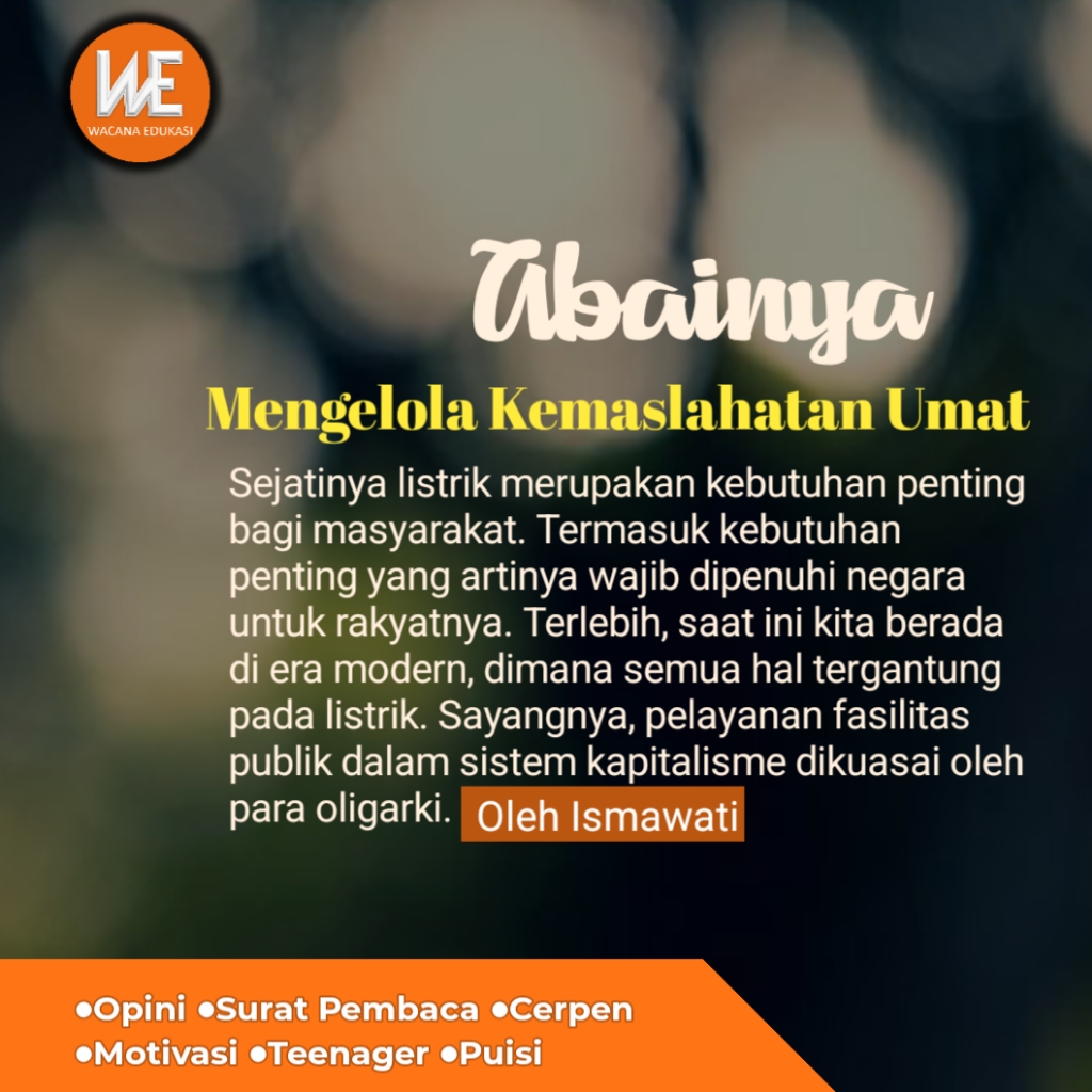 Sejatinya listrik merupakan kebutuhan penting bagi masyarakat. Termasuk kebutuhan penting yang artinya wajib dipenuhi negara untuk rakyatnya. Terlebih, saat ini kita berada di era modern, dimana semua hal tergantung pada listrik. Sayangnya, pelayanan fasilitas publik dalam sistem kapitalisme dikuasai oleh para oligarki. Para kapitalis swasta diberikan regulasi kebebasan mengelola listrik. Listrik hari ini berbayar alias tidak gratis. Belum lagi dihadapi dengan beban kenaikan yang dipicu dari beragam faktor.