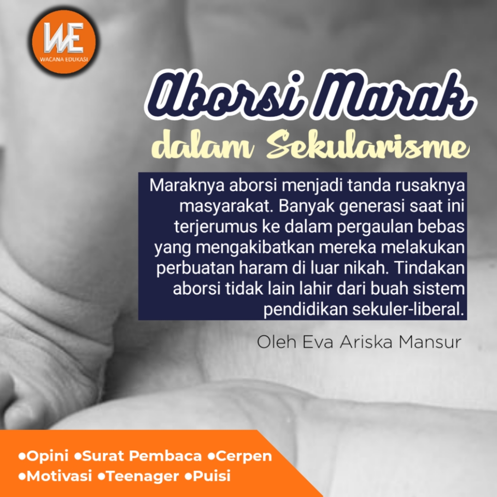 Maraknya aborsi menjadi tanda rusaknya masyarakat. Banyak generasi saat ini terjerumus ke dalam pergaulan bebas yang mengakibatkan mereka melakukan perbuatan haram di luar nikah. Tindakan aborsi tidak lain lahir dari buah sistem pendidikan sekuler-liberal. Potret ini sungguh sangat mengkhawatirkan bagi masa depan generasi. Sebab, sekolah hanya mampu melahirkan generasi cerdas dalam aspek persaingan akademik saja, namun gagal mencetak pribadi beriman dan bertakwa. Akibatnya, individu yang tanpa iman akan gampang melakukan kejahatan tanpa filter iman yang membentenginya. Sehingga gampang terjerumus pergaulan bebas hingga hamil luar nikah, dan berujung pada perbuatan aborsi.