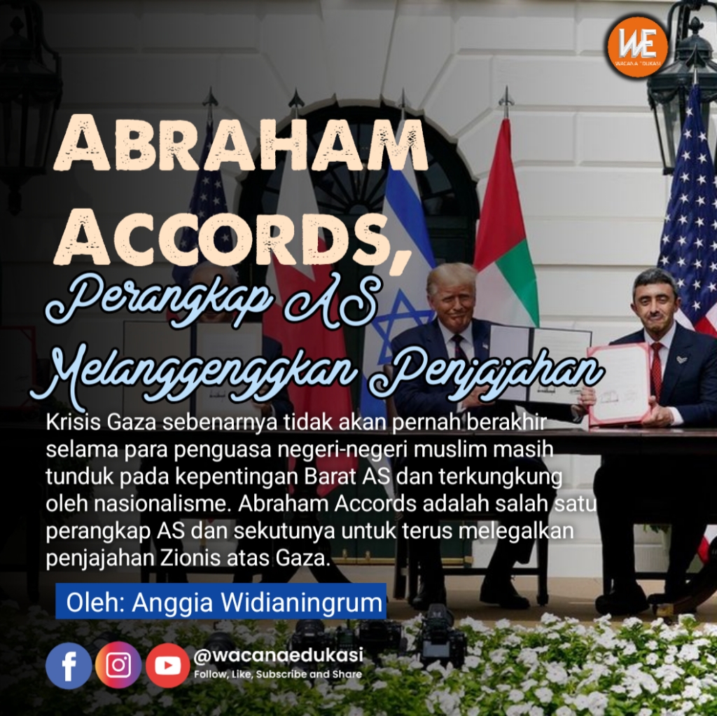 Abraham Accords adalah rangkaian perjanjian normalisasi hubungan diplomatik antara Israel dan beberapa negara Arab seperti UEA, Bahrain, dan Maroko. Perjanjian ini diinisiasi AS pada 2020 dengan dalih meningkatkan stabilitas regional, membuka kerja sama perdagangan, teknologi, ekonomi, serta pariwisata.