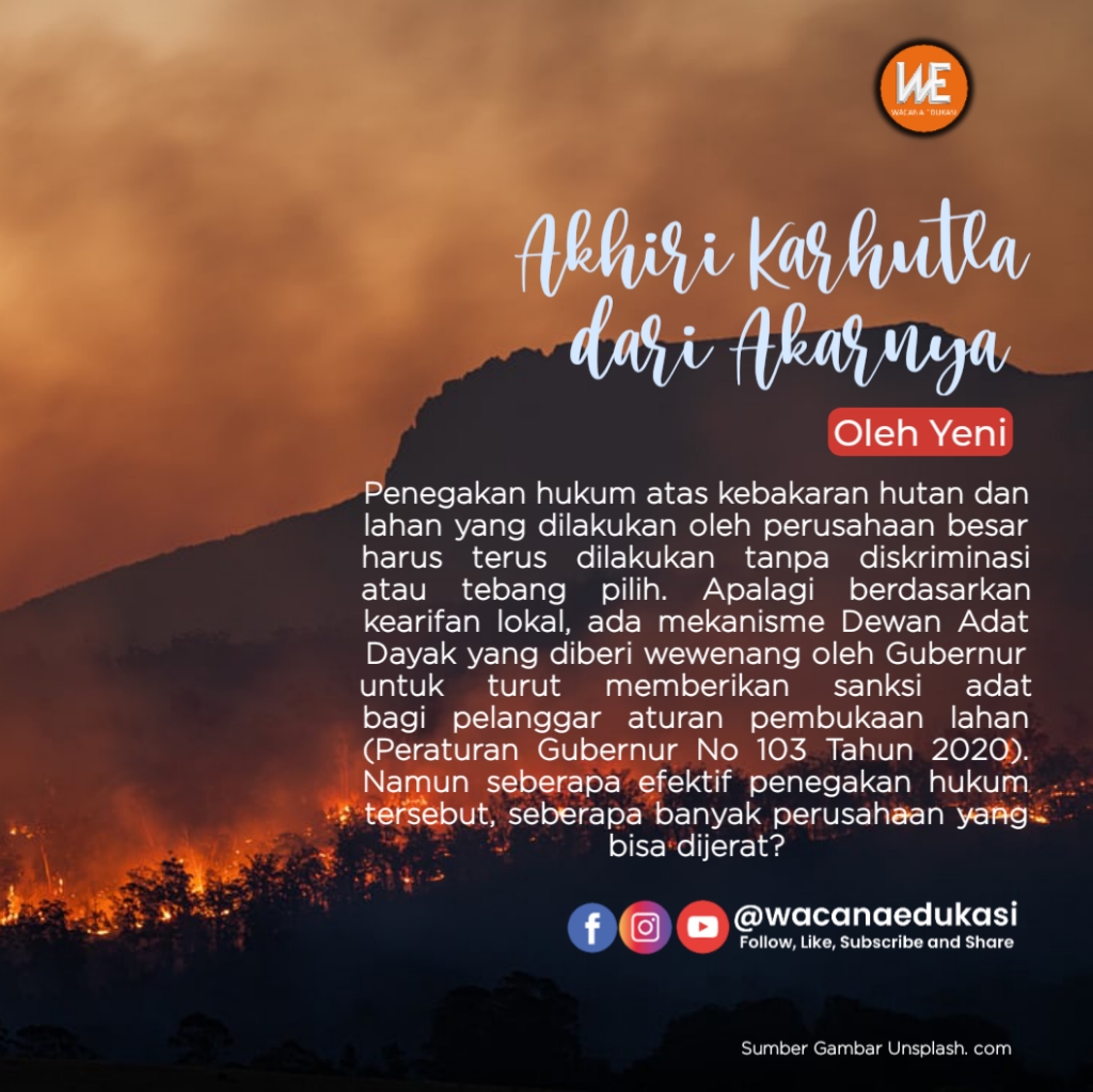 Penegakan hukum atas kebakaran hutan dan lahan yang dilakukan oleh perusahaan besar harus terus dilakukan tanpa diskriminasi atau tebang pilih. Apalagi berdasarkan kearifan lokal, ada mekanisme Dewan Adat Dayak yang diberi wewenang oleh Gubernur untuk turut memberikan sanksi adat bagi pelanggar aturan pembukaan lahan (Peraturan Gubernur No 103 Tahun 2020). Namun seberapa efektif penegakan hukum tersebut, seberapa banyak perusahaan ‘nakal’ yang bisa dijerat sementara kerugian yang diakibatkannya pun sudah terlampau besar dan sulit bisa dikembalikan.