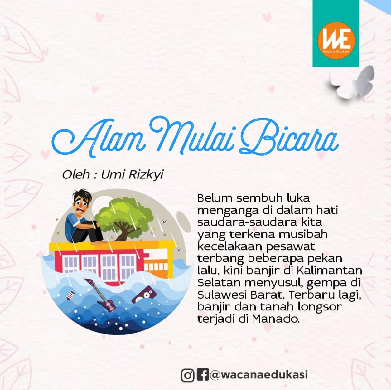 Wacana-edukasi.com — Belum sembuh luka menganga di dalam hati saudara-saudara kita yang terkena musibah kecelakaan pesawat terbang beberapa pekan lalu, kini banjir di Kalimantan Selatan menyusul, gempa di Sulawesi Barat. Terbaru lagi, banjir dan tanah longsor terjadi di Manado.