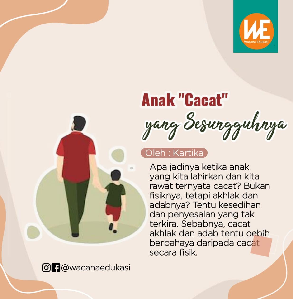 Wacana-edukasi.com — Memiliki anak adalah kebahagian yang tak ternilai. Namun, apa jadinya ketika anak yang kita lahirkan dan rawat ternyata cacat? Bukan fisiknya, tetapi akhlak/adabnya. Tentu kesedihan dan penyesalan yang tak terkira. Sebab, cacat akhlak/adab tentu lebih berbahaya daripada cacat secara fisik. Bahkan bisa dikatakan cacat yang sesungguhnya adalah cacat akhlak/adab.
