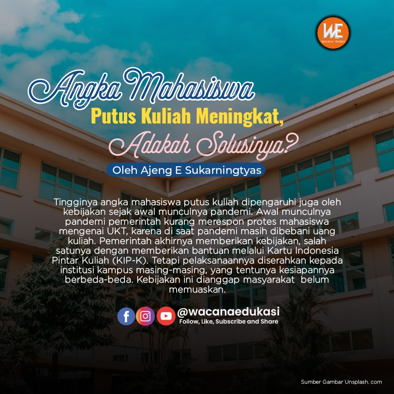 wacana-edukasi.com — Pandemi Covid-19 belum juga berakhir, beberapa sektor mengalami keterpurukan akibat dari pandemi ini. Tidak hanya di bidang kesehatan, dibidang ekonomi dan pendidikan juga mengalami dampak dari pandemi ini. Termasuk diantaranya semakin meningkatnya angka mahasiswa yang putus kuliah.