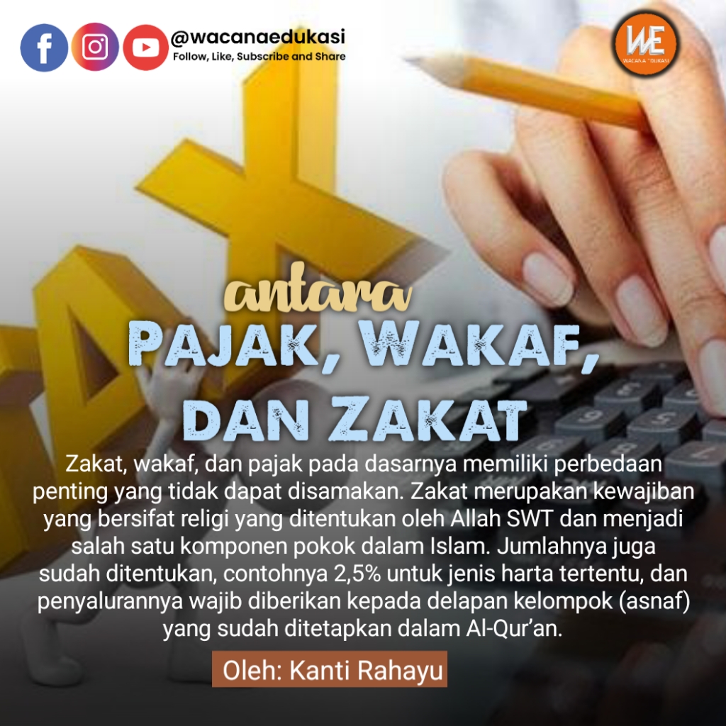 Zakat tidak hanya menyangkut pembagian kekayaan, tetapi juga merupakan ritual yang memiliki nilai spiritual. Di sisi lain, wakaf dianggap sebagai suatu anjuran (sunnah muakkad) yang bertujuan untuk memberikan manfaat dalam jangka panjang bagi masyarakat. Dalam konsep wakaf, aset utama tidak diperbolehkan untuk dijual atau diwariskan, melainkan dipergunakan untuk kepentingan umum, seperti pembangunan masjid, sekolah, rumah sakit, dan lahan produktif. Sementara itu, pajak sama sekali berbeda. Pajak bukanlah suatu ibadah, melainkan kebijakan yang dibuat oleh pemerintah melalui undang-undang yang dibuat oleh manusia. Tujuannya adalah untuk mendanai kebutuhan negara, mulai dari gaji para pejabat, proyek infrastruktur, hingga pembayaran utang.