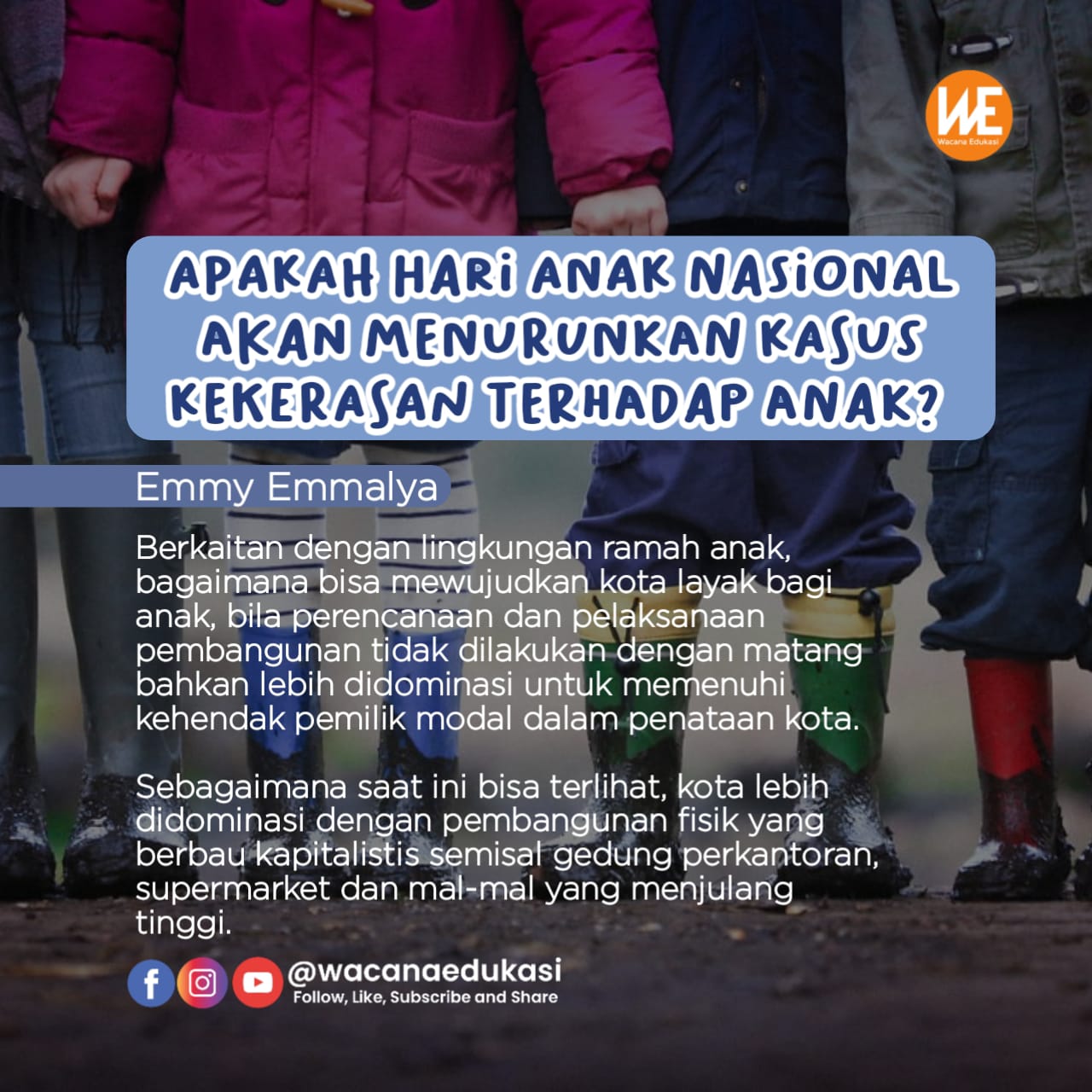 Berkaitan dengan lingkungan ramah anak, bagaimana bisa mewujudkan kota layak bagi anak, bila perencanaan dan pelaksanaan pembangunan tidak dilakukan dengan matang bahkan lebih didominasi untuk memenuhi kehendak pemilik modal dalam penataan kota.