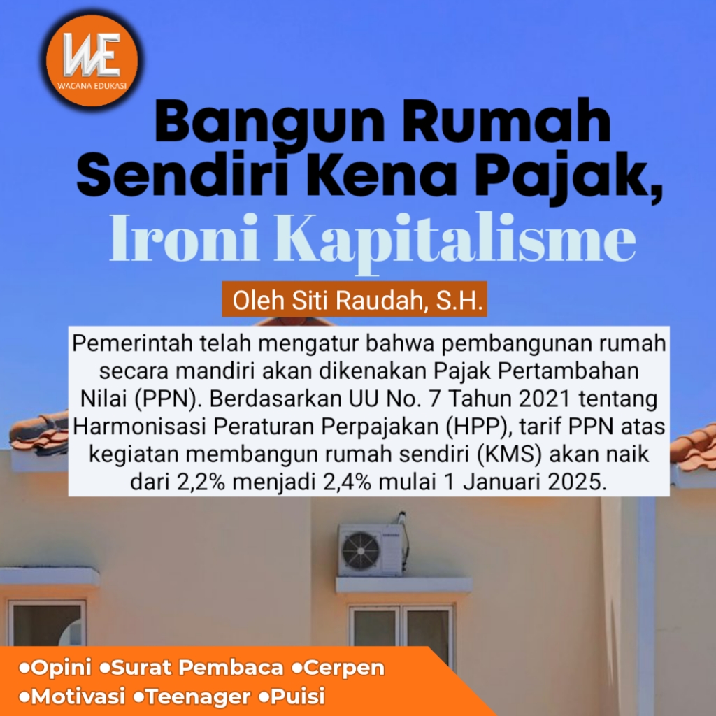 Wacana-edukasi.com, OPINI-– Pemerintah telah mengatur bahwa pembangunan rumah secara mandiri akan dikenakan Pajak Pertambahan Nilai (PPN). Berdasarkan UU No. 7 Tahun 2021 tentang Harmonisasi Peraturan Perpajakan (HPP), tarif PPN atas kegiatan membangun rumah sendiri (KMS) akan naik dari 2,2% menjadi 2,4% mulai 1 Januari 2025. Kegiatan membangun rumah sendiri yang dimaksud adalah proses pendirian bangunan yang dilakukan oleh individu, di mana bangunan tersebut nantinya digunakan untuk kepentingan pribadi atau oleh orang lain.