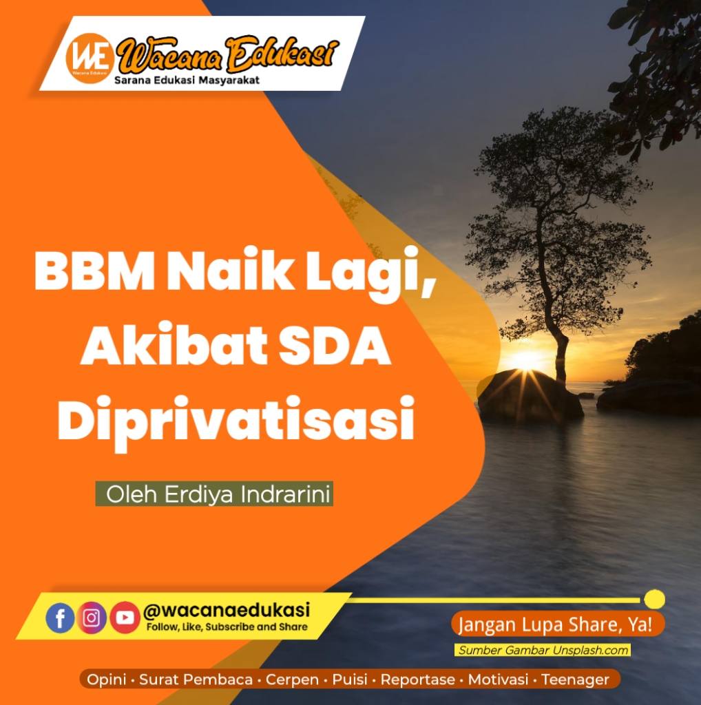 Parahnya, untuk menunjukkan kepeduliannya kepada rakyat, negara memakai topeng berupa pemberian subsidi. Padahal, seharusnya negara adalah pihak yang bertanggung jawab secara penuh dalam pengelolaan SDA, dan hasilnya untuk memenuhi seluruh hajat hidup rakyatnya. Yang demikian itu agar hasil SDA bisa dinikmati semua rakyat dengan mudah, murah, bahkan gratis. Namun, itu tidak akan pernah terjadi. Karena, inilah Indonesia, negeri kaya SDA yang mengaku berideologi Pancasila, namun menerapkan ideologi kapitalisme buatan penjajah.