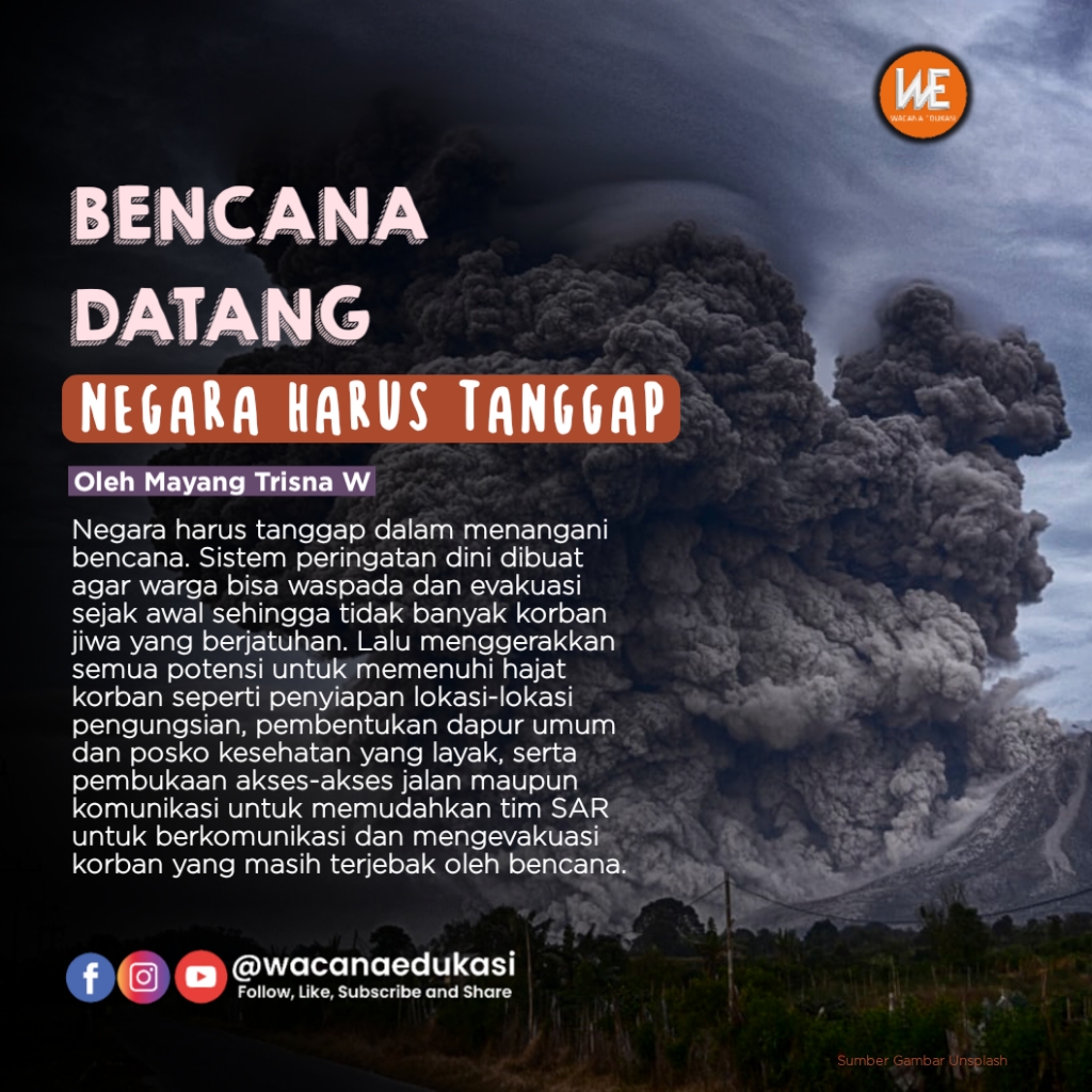 Negara harus tanggap dalam menangani bencana. Sistem peringatan dini dibuat agar warga bisa waspada dan evakuasi sejak awal sehingga tidak banyak korban jiwa yang berjatuhan. Lalu menggerakkan semua potensi untuk memenuhi hajat korban seperti penyiapan lokasi-lokasi pengungsian, pembentukan dapur umum dan posko kesehatan yang layak, serta pembukaan akses-akses jalan maupun komunikasi untuk memudahkan tim SAR untuk berkomunikasi dan mengevakuasi korban yang masih terjebak oleh bencana.