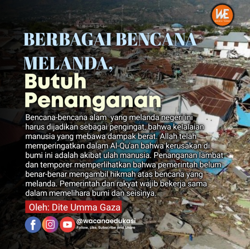 Bencana-bencana alam yang melanda negeri ini harus dijadikan sebagai pengingat, bahwa kelalaian manusia yang mebawa dampak berat. Allah telah memperingatkan dalam Al-Qu’an bahwa kerusakan di bumi ini adalah akibat ulah manusia. Penanganan lambat dan temporer memperlihatkan bahwa pemerintah belum benar-benar mengambil hikmah atas bencana yang melanda. Pemerintah dan rakyat wajib bekerja sama dalam memelihara bumi dan seisinya. Sudah saatnya menerapkan mitigasi yang adil, terencana dan sesuai dengan nilai-nilai Islam.