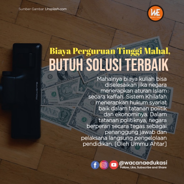 Mahalnya biaya kuliah bisa diselesaikan jika negara menerapkan aturan Islam secara kaffah. Sistem Khilafah menerapkan hukum syariat baik dalam tatanan politik dan ekonominya. Dalam tatanan politiknya, negara berperan secara tegas sebagai penanggung jawab dan pelaksana langsung pengelolaan pendidikan. Negara tidak akan melemparkan tanggung jawab kepada swasta atau korporasi atau pun masyarakat. Jika mereka hendak terlibat, hanyalah sebagai amal shaleh tidak sampai mengambil alih peran negara.
