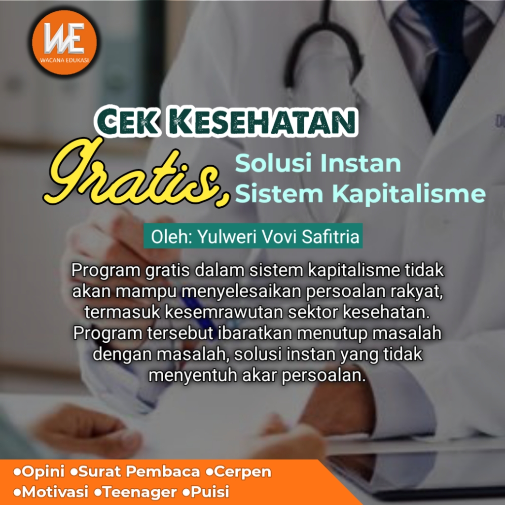 Program gratis dalam sistem kapitalisme tidak akan mampu menyelesaikan persoalan rakyat, termasuk kesemrawutan sektor kesehatan. Program tersebut ibaratkan menutup masalah dengan masalah, solusi instan yang tidak menyentuh akar persoalan.