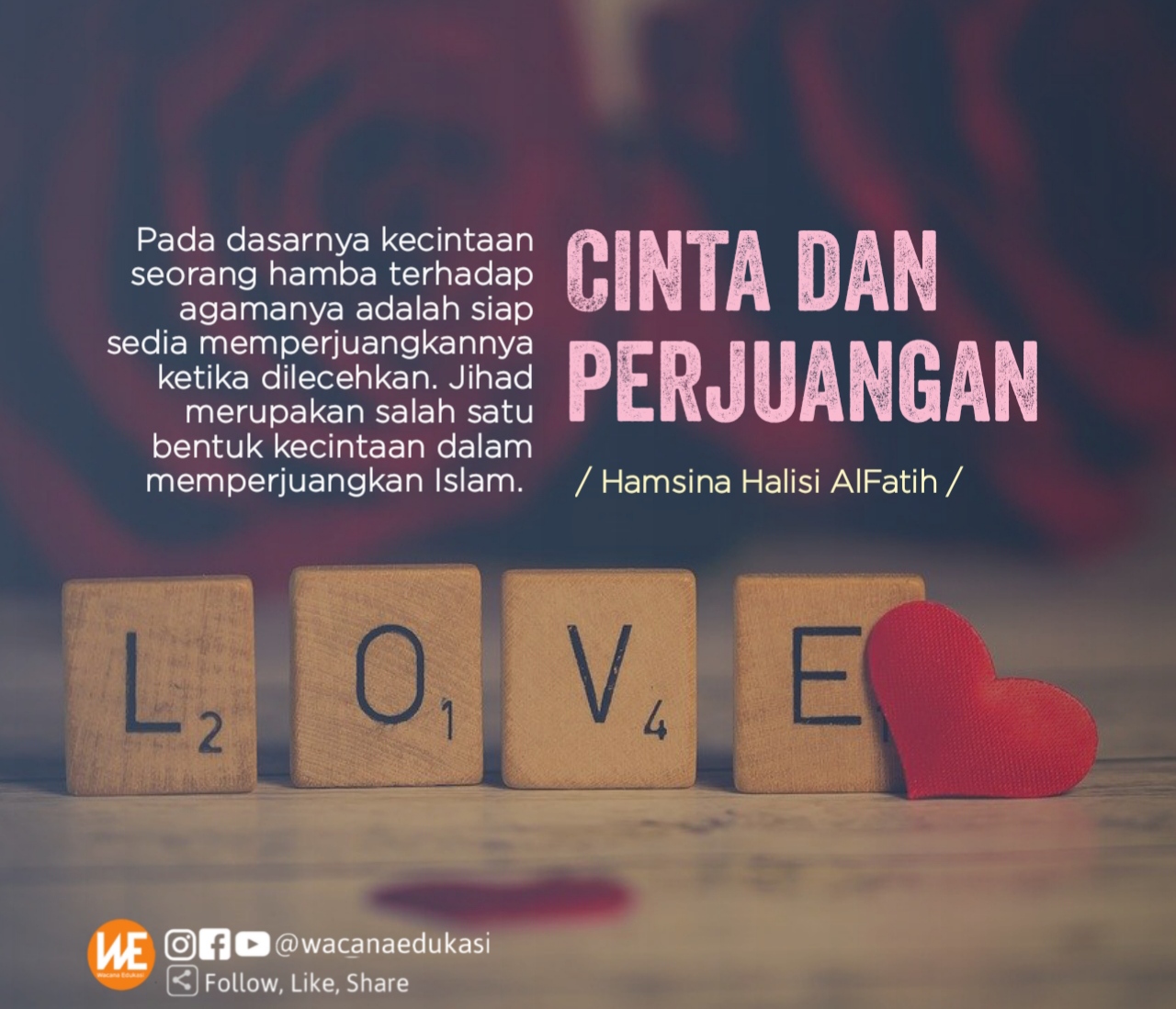 Jika saat ini kita dilelahkan dengan banyaknya permasalahan umat, mendakwahkan Islam agar dipahami oleh orang banyak, serta membongkar busuknya sistem saat ini tapi yakinlah atas manisnya cinta dan perjuangan kita untuk Islam akan mengalahkan segalanya. Allah SWT telah memilih kita sebagai penolong agamanya, maka tak ada kata lelah dalam perjuangan hingga titik kemenangan itu tiba. Semoga cinta kita terhadap Islam akan semakin memberi keistiqomahan dalam barisan perjuangan.