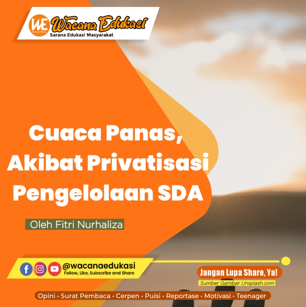 wacana-edukasi.com, SURAT PEMBACA– Cuaca panas adalah kondisi dimana udara terasa kering akibat panas sinar matahari. Kondisi ini biasanya terjadi pada saat cahaya matahari berada di posisi tegak lurus ke bumi. Suhu atau temperatur udara yang meningkat dapat mempengaruhi kesehatan, jadi cuaca panas ini dapat mengancam berbagai penyakit diantaranya adalah dehidrasi, iritasi kulit, sakit kepala, demam tinggi, dll. Cuaca panas terkadang dapat mengganggu aktivitas sehari-hari. Sebab, ketika cuaca sedang panas, dapat membuat tubuh menjadi lemas dan mudah berkeringat.