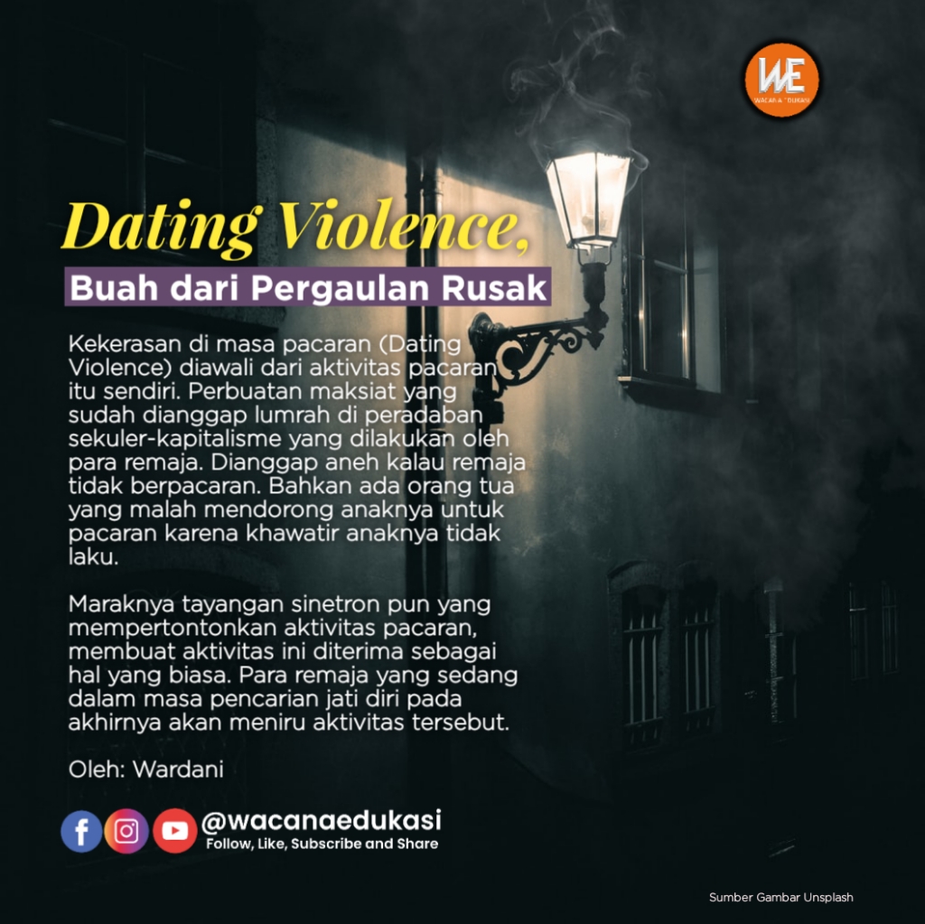 Jadi untuk menghentikan dating violence hanya bisa dilakukan dengan kembali ke aturan yang shahih, yaitu Islam. Bukan hanya dengan menghukum si pelaku. Atupun solusi liberal seperti pembuatan aturan seperti RUU PKS. (wallahu a’lam)
