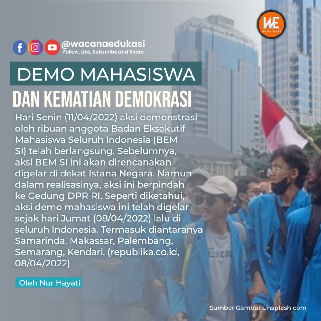 wacana-edukasi.com– Hari Senin (11/04/2022) aksi demonstrasi oleh ribuan anggota Badan Eksekutif Mahasiswa Seluruh Indonesia (BEM SI) telah berlangsung. Sebelumnya, aksi BEM SI ini akan direncanakan digelar di dekat Istana Negara. Namun dalam realisasinya, aksi ini berpindah ke Gedung DPR RI. Seperti diketahui, aksi demo mahasiswa ini telah digelar sejak hari Jumat (08/04/2022) lalu di seluruh Indonesia. Termasuk diantaranya Samarinda, Makassar, Palembang, Semarang, Kendari. (republika.co.id, 08/04/2022)