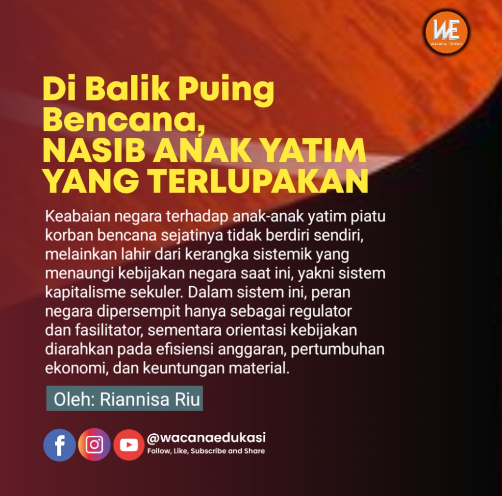 Keabaian negara terhadap anak-anak yatim piatu korban bencana sejatinya tidak berdiri sendiri, melainkan lahir dari kerangka sistemik yang menaungi kebijakan negara saat ini, yakni sistem kapitalisme sekuler. Dalam sistem ini, peran negara dipersempit hanya sebagai regulator dan fasilitator, sementara orientasi kebijakan diarahkan pada efisiensi anggaran, pertumbuhan ekonomi, dan keuntungan material. Akibatnya, urusan yang tidak menghasilkan nilai ekonomi langsung, seperti pengasuhan anak yatim piatu ini, kerap dipandang sebagai beban, bukan kewajiban.