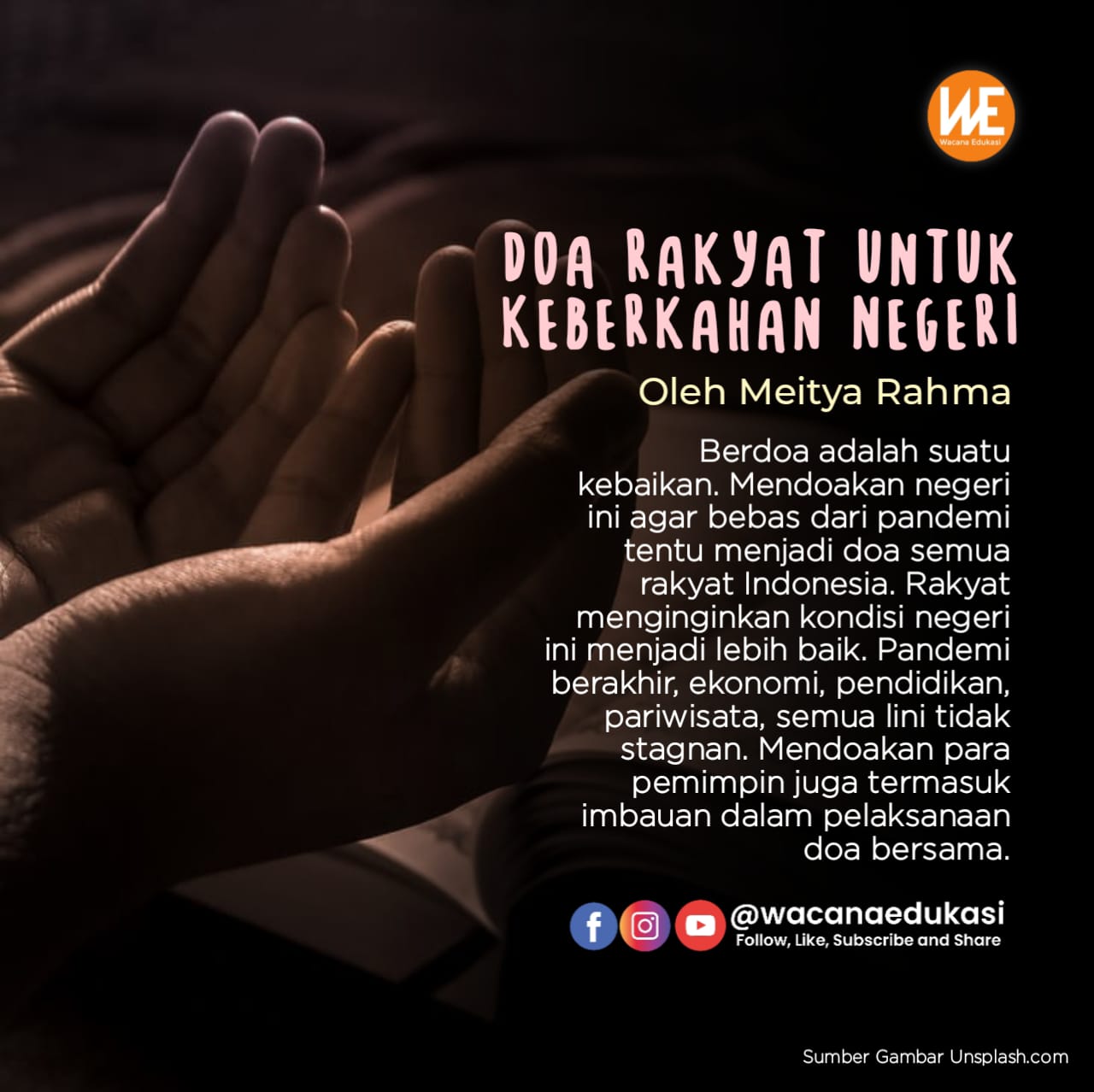 Berdoa adalah suatu kebaikan. Mendoakan negeri ini agar bebas dari pandemi tentu menjadi doa semua rakyat Indonesia. Rakyat menginginkan kondisi negeri ini menjadi lebih baik. Pandemi berakhir, ekonomi, pendidikan, pariwisata, semua lini tidak stagnan. Mendoakan para pemimpin juga termasuk himbauan dalam pelaksanaan doa bersama. Pemimpin amanah adalah harapan semua rakyat. Sebagai rakyat, saat ini yang dibutuhkan adalah pemimpin yang mau mengerti rakyat, mau mengurusi secara totalitas, bukan setengah setengah-setengah. Pemimpin yang diibaratkan seperti junnah, yang bisa melindungi rakyatnya. Bukan malah melindungi para kapital yang ingin menguasi negeri ini. Efek pandemi yang tak berkesudahan ini akan membawa rakyat pada krisis kepemimpinan. Buruknya riayah (pengurusan) penguasa terhadap rakyat terlihat dalam penanganan pandemi ini. Rakyat diminta mentaati aturan penguasa. Namun aturan tersebut tidak berpihak pada rakyat. Contohnya saja UU omnibus law, UU Minerba (mineral batubara), dll menjadi bukti ketidak berpihakan aturan terhadap rakyat.