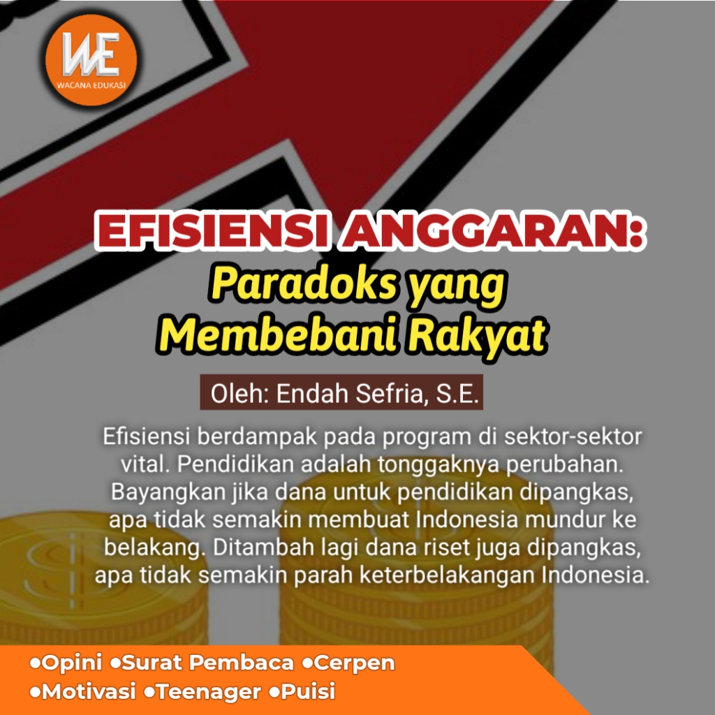 Efisiensi berdampak pada program di sektor-sektor viral. Pendidikan adalah tonggaknya perubahan. Bayangkan jika dana untuk pendidikan dipangkas, apa tidak semakin membuat Indonesia mundur ke belakang. Ditambah lagi dana riset juga dipangkas, apa tidak semakin parah keterbelakangan Indonesia.