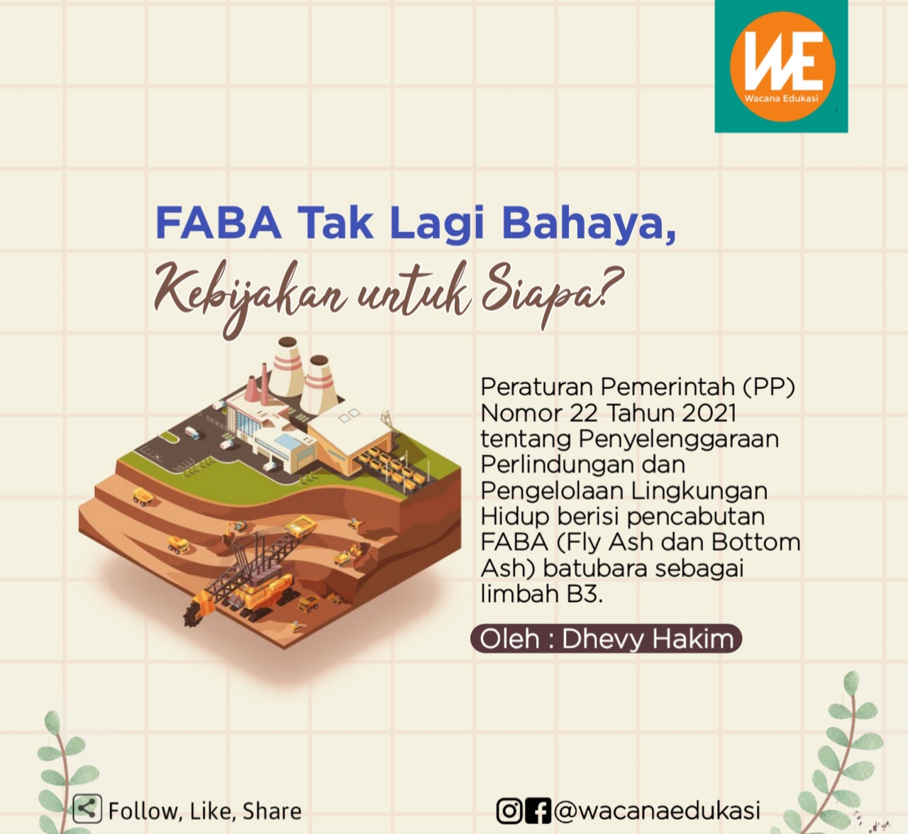 Peraturan Pemerintah (PP) Nomor 22 Tahun 2021 tentang Penyelenggaraan Perlindungan dan Pengelolaan Lingkungan Hidup berisi pencabutan FABA (Fly Ash dan Bottom Ash) batubara sebagai limbah B3. Sedangkan FABA sendiri merupakan limbah padat yang dihasilkan dari proses pembakaran batu bara pada pembangkit listrik tenaga uap PLTU, boiler, dan tungku industri untuk bahan baku atau keperluan sektor konstruksi. Artinya industri yang mengeluarkan limbah FABA tak lagi dibuat repot untuk mengurusi pembuangan limbahnya, keamanan AMDAL nya. Padahal limbah FABA sangat berbahaya bagi kesehatan dan lingkungan warga sekitar.