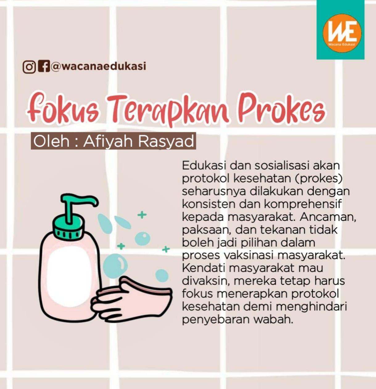 Edukasi dan sosialisasi akan protokol kesehatan (prokes) seharusnya dilakukan dengan konsisten dan komprehensif kepada masyarakat. Ancaman, paksaan, dan tekanan tidak boleh jadi pilihan dalam proses vaksinasi masyarakat. Kendati masyarakat mau divaksin, mereka tetap harus fokus menerapkan protokol kesehatan demi menghindari penyebaran wabah.
