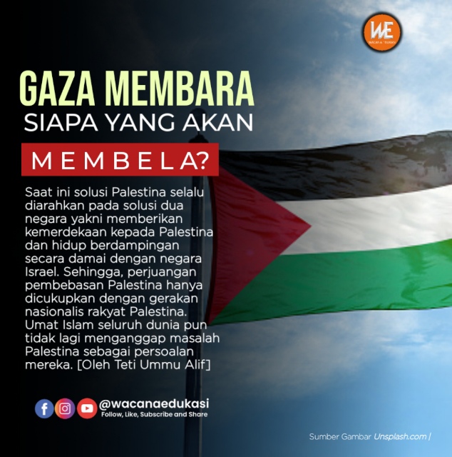 Saat ini solusi Palestina selalu diarahkan pada solusi dua negara yakni memberikan kemerdekaan kepada Palestina dan hidup berdampingan secara damai dengan negara Israel. Sehingga, perjuangan pembebasan Palestina hanya dicukupkan dengan gerakan nasionalis rakyat Palestina. Umat Islam seluruh dunia pun tidak lagi menganggap masalah Palestina sebagai persoalan mereka. Tetapi, hanya sebatas persoalan internal rakyat Palestina semata. Padahal, solusi yang demikian sama saja dengan membiarkan tanah Palestina direbut Yahudi dan menyisakan sedikit untuk rakyat Palestina. Tentu ini merupakan solusi batil dan tidak sesuai dengan Islam.