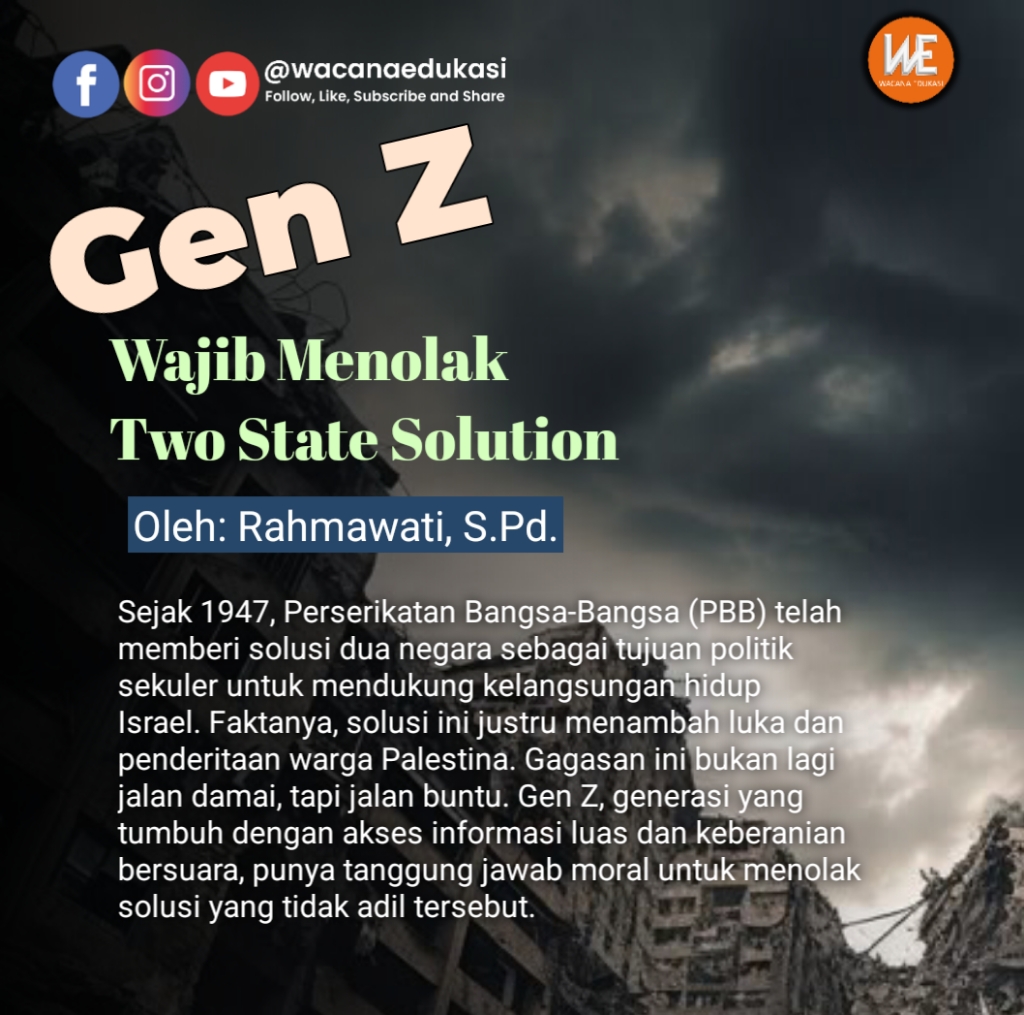 Muslim Generasi Z harus menolak solusi dua negara karena solusi tersebut merupakan jebakan politik yang menyesatkan. Hanya dengan penerapan Islam secara menyeluruh, maka dunia akan menyaksikan munculnya peradaban yang menjunjung tinggi keadilan sejati, menghormati semua orang, dan mengembalikan tanah Palestina kepada pemiliknya yang sah.