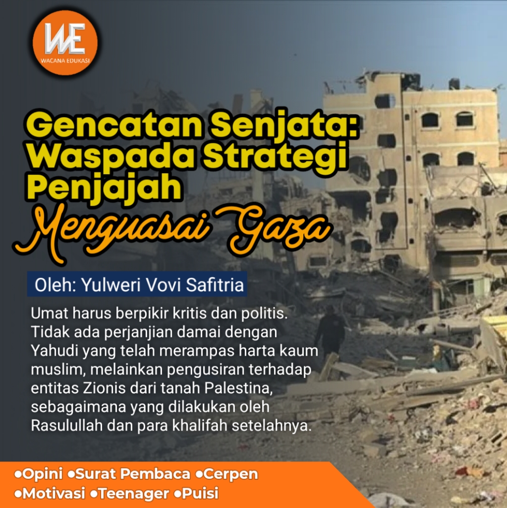 Oleh karena itu, sudah sepatutnya umat waspada dan tidak lengah. Mungkinkah gencatan senjata hanyalah alasan untuk menyusun strategi baru penjajah guna menghabisi rakyat Gaza? Apalagi sempat beredar kabar terkait akan dipindahkannya dua juta warga Gaza ke Indonesia.