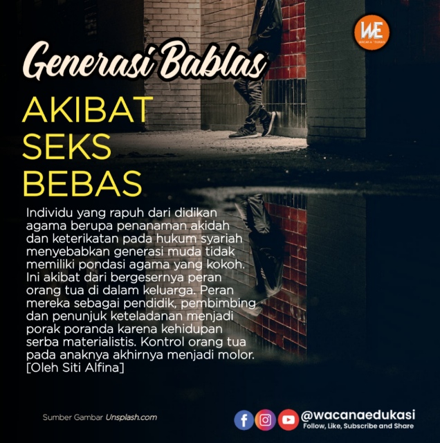 Dengan gaya hidup liberal, generasi muda pun tenggelam dalam kubangan pergaulan. Aktivitas penuh kemaksiatan dengan enteng dijalankan. Berpacaran dianggap biasa dan gaul sebagai konsekuensi hidup kekinian.