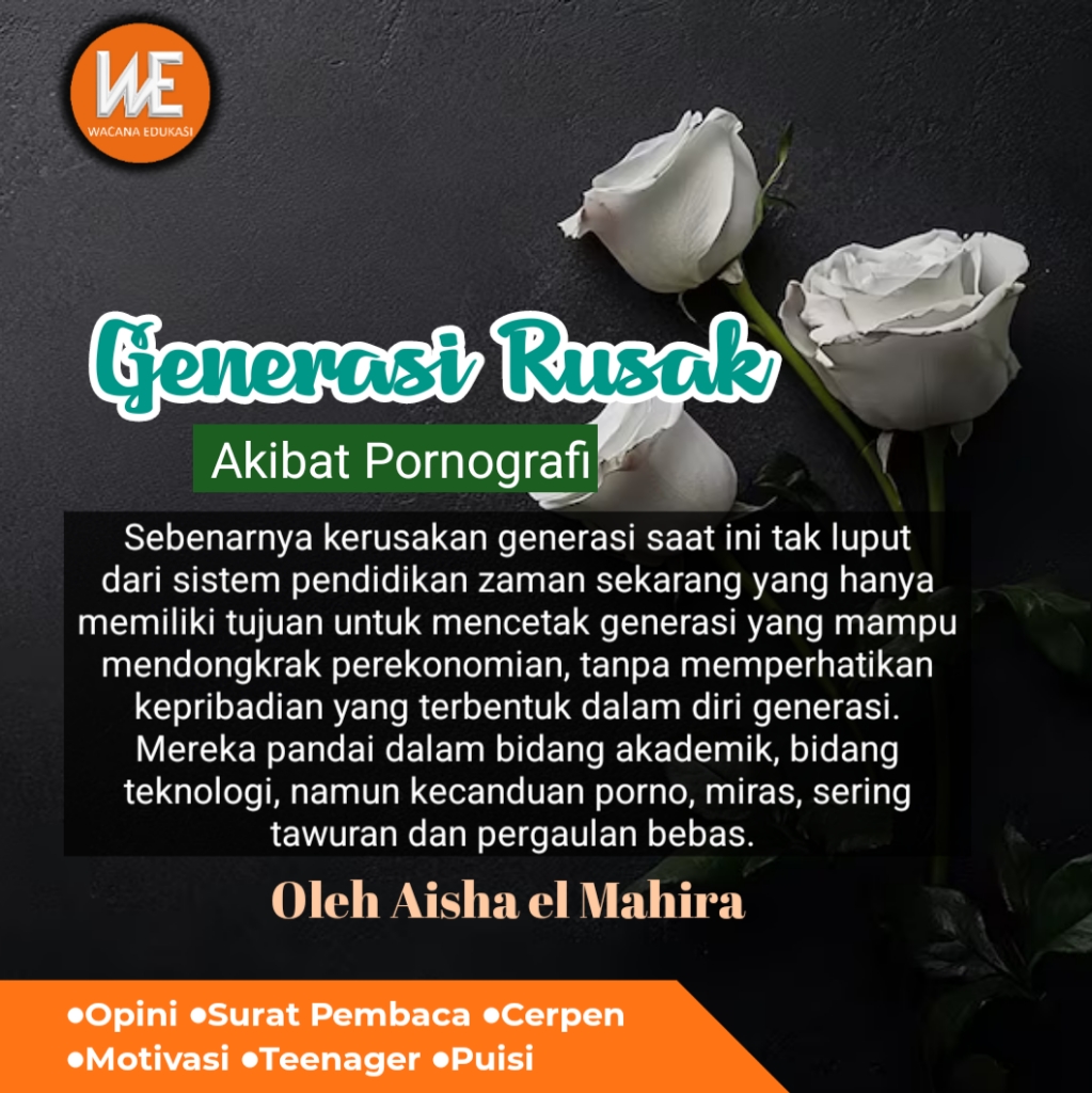 Melihat generasi yang makin kesini perilakunya makin kesana, makin jauh dari jati diri seorang muslim, membuat hati tanpa sadar merasa tergeruk. Para remaja bahkan dari anak SD sampai mahasiswa banyak yang menjadi pelaku pemerkosaan akibat kecanduan pornografi, lebih parahnya lagi mereka bangga dengan kejahatan yang dilakukannya.
