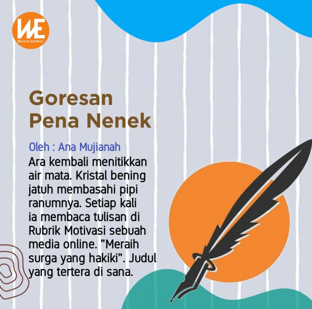 “Nenek?” gumam gadis itu lirih, penuh selidik. Rasa penasaran mengalahkan keengganan hatinya. Mendapati nama nenek yang dirindukannya ada di sana. Ara meresapi aksara demi aksara yang tertuang dalam goresan pena motivasi itu. Hingga sampailah di paragraf akhir, tangisnya pecah tak tertahan. Kenangan sosok nenek tercinta yang telah pergi menghadap Rabbnya, sebulan lalu, kembali hadir memenuhi ruang hatinya.