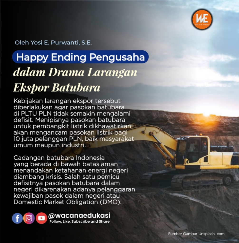 Cadangan batubara Indonesia yang sangat melimpah, bahkan terbesar ketiga di dunia ini, tidak hanya untuk memenuhi ketersediaan dalam negeri, namun juga diekspor ke negeri lain. Namun sayangnya, negeri pertiwi ini menilai bahwa cadangan batu bara semakin menipis, bahkan krisis. Kebijakan larangan ekspor batubara pun diberlakukan. Mulai tanggal 1 Januari hingga 31 Januari 2022, Pemerintah resmi memberlakukan kebijakan larangan ekspor batubara terhadap seluruh perusahaan tambang batubara di Indonesia.