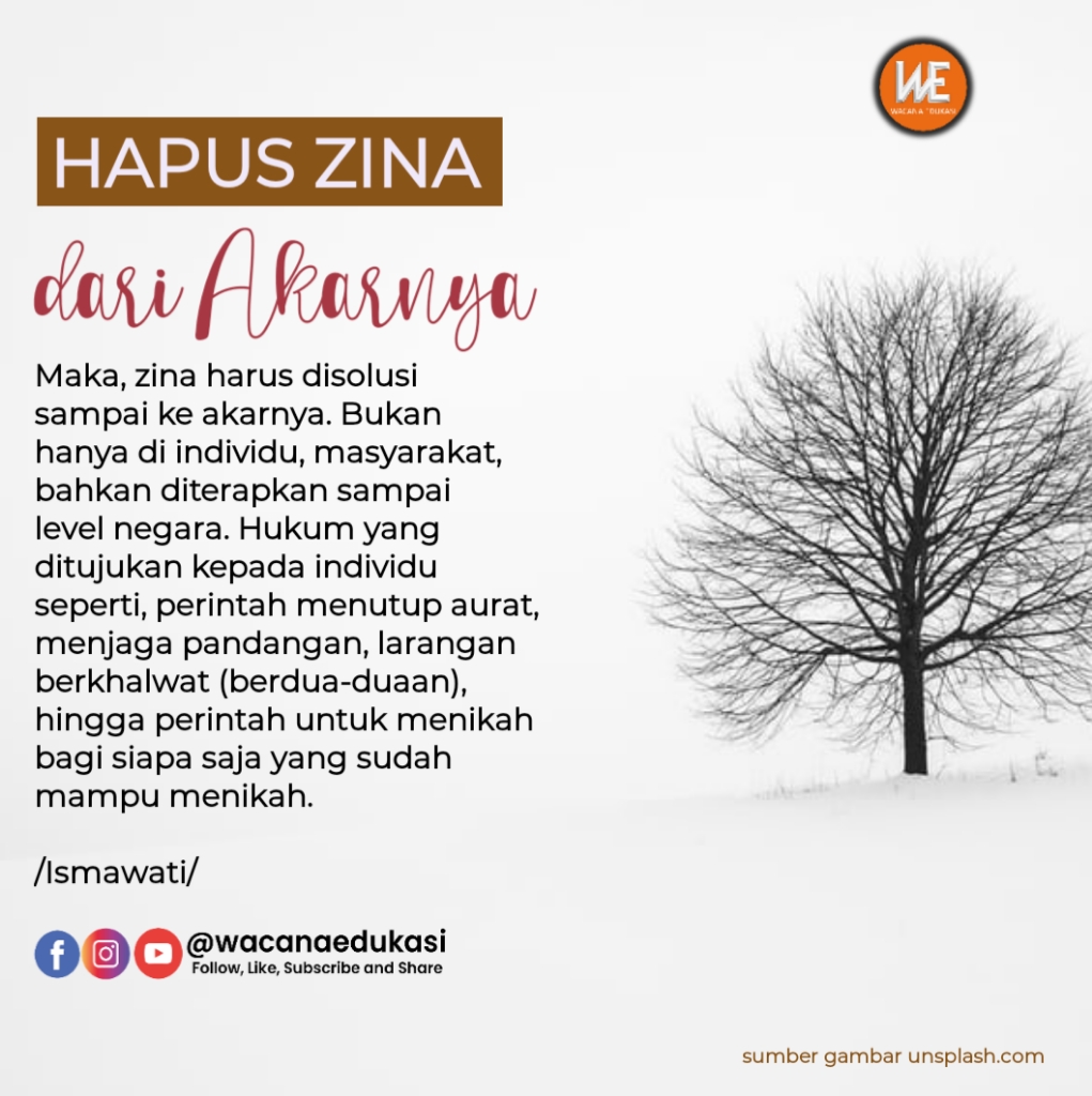 Maka, zina harus disolusi sampai ke akarnya. Bukan hanya di individu, masyarakat, bahkan diterapkan sampai level negara. Hukum yang ditujukan kepada individu seperti, perintah menutup aurat, menjaga pandangan, larangan berkhalwat (berdua-duaan), hingga perintah untuk menikah bagi siapa saja yang sudah mampu menikah.
