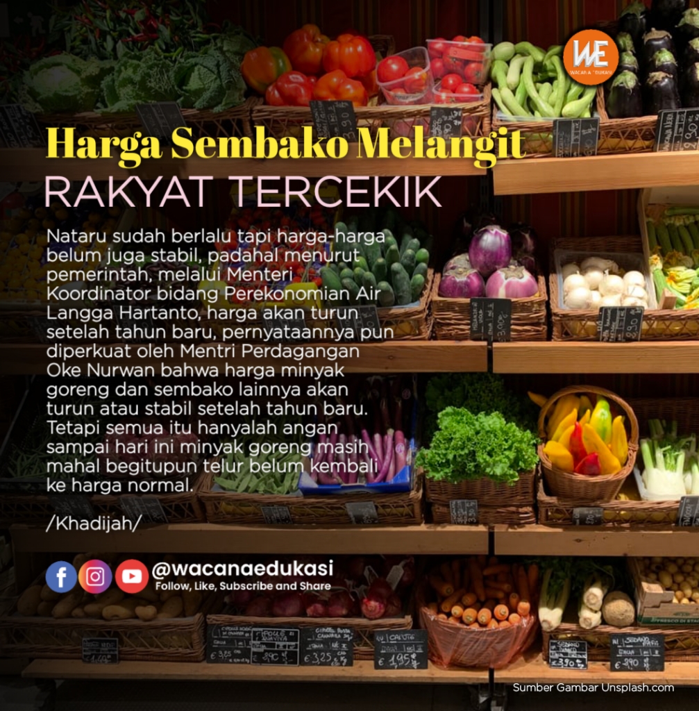 wacana-edukasi.com— Pusing, itulah kata yang keluar dari mulut seorang ibu ketika berbelanja karena banyak sekali harga sembako yang naik, mulai dari beras, telur, cabai, bahkan harga deterjen pun ikut naik. Mengapa hal ini terus berulang tanpa ada penyelesain?
