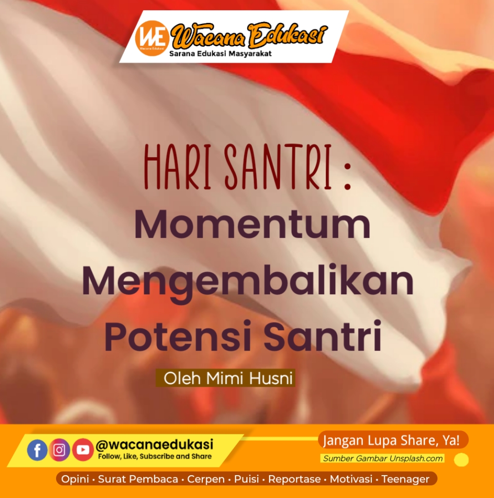 wacana-edukasi.com, SURAT PEMBACA– Hari Santri 2023 mengusung tema “Jihad Santri Jayakan Negeri”. Perayaan 22 Oktober mengacu pada resolusi Jihad yang dikeluarkan Kyai Haji Hasyim Asy’ari pada 22 Oktober 1945 yang menyerukan jihad menolak dan menentang penjajah. Kisahnya menceritakan betapa besarnya peran para santri di setiap daerah dalam perjuangan mengusir kolonialis dari negeri tercinta Indonesia.