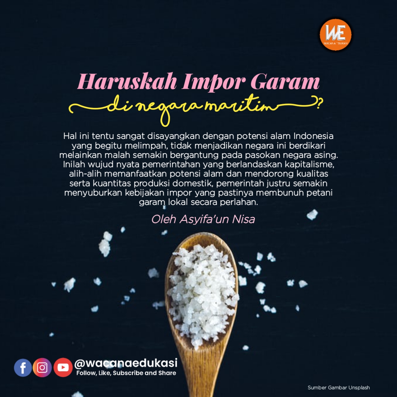 Hal ini tentu sangat disayangkan dengan potensi alam Indonesia yang begitu melimpah, tidak menjadikan negara ini berdikari melainkan malah semakin bergantung pada pasokan negara asing. Inilah wujud nyata pemerintahan yang berlandaskan kapitalisme, alih-alih memanfaatkan potensi alam dan mendorong kualitas serta kuantitas produksi domestik, pemerintah justru semakin menyuburkan kebijakan impor yang pastinya membunuh petani garam lokal secara perlahan. Bahkan kondisi petani garam kian terpuruk, motivasi mereka melakukan produksi semakin terkikis dengan banyaknya garam impor yang tentunya membuat harga garam dipasaran anjlok. Belum lagi permasalahan distribusi garam terkait mahalnya biaya transportasi hingga ketidakmampuan menjangkau pasar.