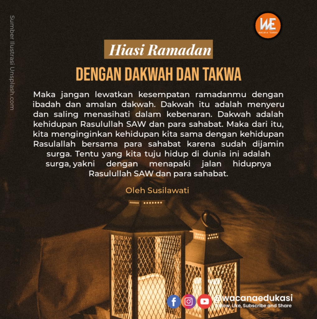 Maka jangan lewatkan kesempatan ramadanmu dengan ibadah dan amalan dakwah. Dakwah itu adalah menyeru dan saling menasihati dalam kebenaran. Dakwah adalah kehidupan Rasulullah SAW dan para sahabat. Maka dari itu, kita menginginkan kehidupan kita sama dengan kehidupan Rasulallah bersama para sahabat karena sudah dijamin surga. Tentu yang kita tuju hidup didunia ini adalah surga, yakni dengan menapaki jalan hidupnya Rasulullah SAW dan para sahabat.
