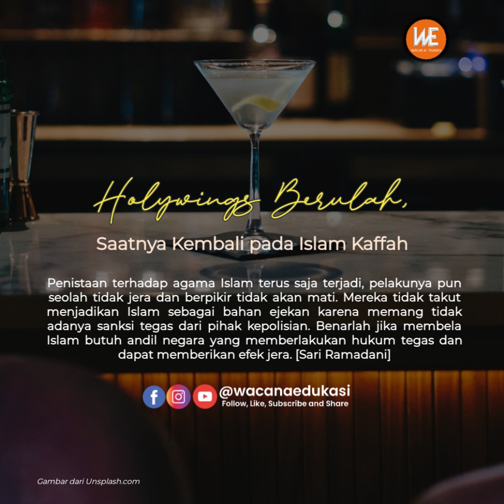 Lagi dan lagi, penistaan terhadap agama Islam terulang kembali. Sudah sangat jelas bahwa tindakan yang dilakukan Holywings merupakan pelecehan terhadap agama Islam, karena menyandingkan manusia mulia yaitu Nabi Muhammad dan Maria yang kita kenal di dalam Islam dengan nama Maryam ibunda Nabi Isa a.s. dengan khamar yang jelas haram di dalam Islam.