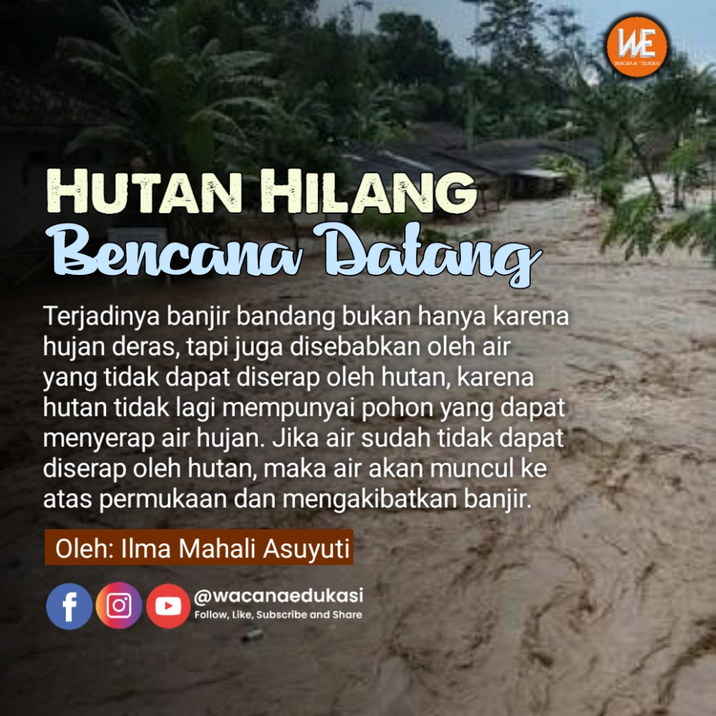 Terjadinya banjir bandang bukan hanya karena hujan deras, tapi juga disebabkan oleh air yang tidak dapat diserap oleh hutan, karena hutan tidak lagi mempunyai pohon yang dapat menyerap air hujan. Jika air sudah tidak dapat diserap oleh hutan, maka air akan muncul ke atas permukaan dan mengakibatkan banjir.