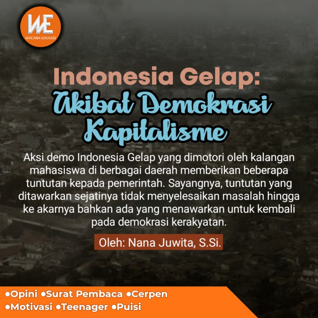 *********** *Aksi demo Indonesia Gelap* yang dimotori oleh kalangan mahasiswa di berbagai daerah memberikan beberapa tuntutan kepada pemerintah. Sayangnya tuntutan yang ditawarkan sejatinya tidak menyelesaikan masalah hingga ke akarnya bahkan ada yang menawarkan untuk kembali pada demokrasi kerakyatan. Padahal penerapan sistem demokrasilah yang menjadi akar permasalahannya, sehingga khawatir nasib rakyat Indonesia di masa mendatang akan tetap (Indonesia Gelap).