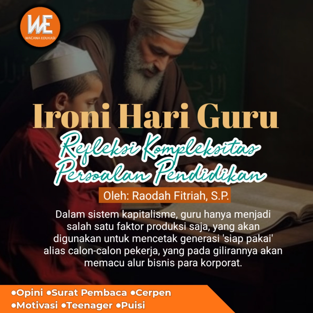 Dalam sistem kapitalisme, guru hanya menjadi salah satu faktor produksi saja, yang akan digunakan untuk mencetak generasi ‘siap pakai’ alias calon-calon pekerja, yang pada gilirannya akan memacu alur bisnis para korporat. Orientasi pendidikan seperti ini mengeliminasi nilai ruhiyah (agama) dalam bidang pendidikan. Wajar saja guru maupun siswa di negeri ini hanya menjadi pelaku diskiriminasi dan kriminalitas. Jika hal ini terus dibiarkan ada, maka peran guru sebagai pendidik generasi peradaban nihil akan terwujud.