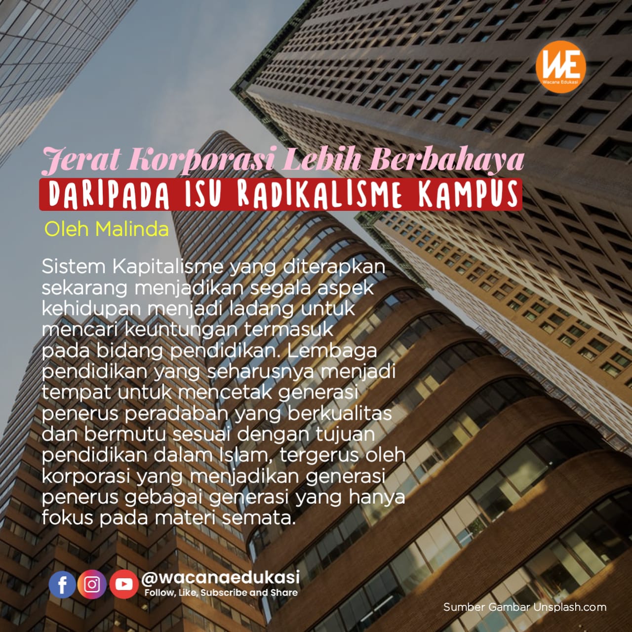 Sistem kapitalisme yang diterapkan sekarang menjadikan segala aspek kehidupan menjadi ladang untuk mencari keuntungan termasuk pada bidang pendidikan. Lembaga pendidikan yang seharusnya menjadi tempat untuk mencetak generasi penerus peradaban yang berkualitas dan bermutu sesuai dengan tujuan pendidikan dalam Islam, tergerus oleh korporasi yang menjadikan generasi penerus gebagai generasi yang hanya fokus pada materi semata.