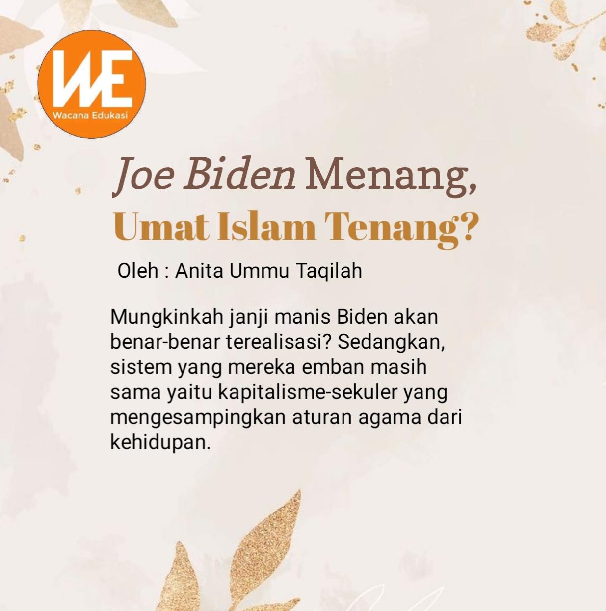 Mungkinkah janji-janji manis Biden akan benar-benar terealisasi? Sedangkan, sistem yang mereka emban masih sama. Yaitu kapitalisme-sekuler yang memisahkan aturan agama dari kehidupan. Semoga, kemenangan Biden tak hanya memberi ketenangan sesaat yang melenakan umat Islam dari perjuangan Islam kaffah.