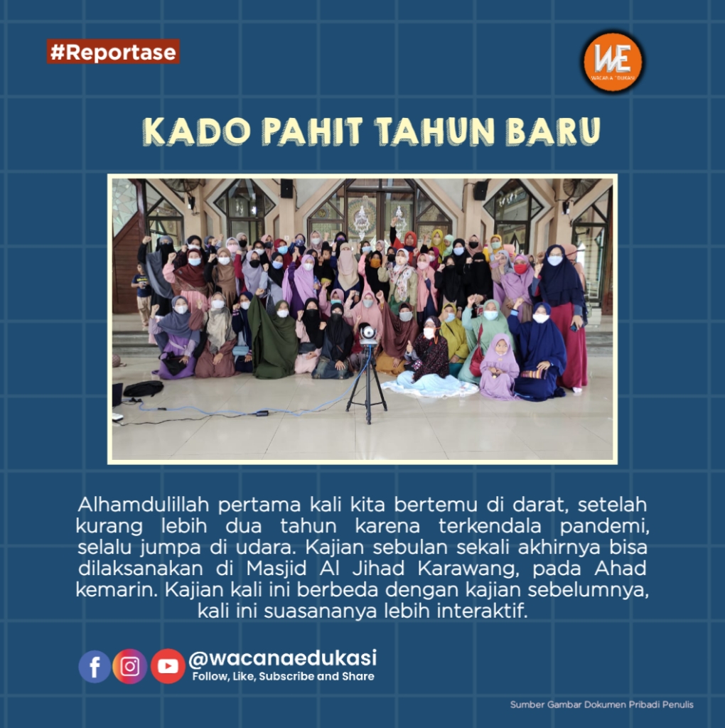 wacana-Edukasi.com—Alhamdulillah pertama kali kita bertemu di darat, setelah kurang lebih dua tahun karena terkendala pandemi, selalu jumpa di udara. Kajian sebulan sekali akhirnya bisa dilaksanakan di Masjid Al Jihad Karawang, pada Ahad. Kajian kali ini berbeda dengan kajian sebelumnya, kali ini suasananya lebih interaktif. Kajian bulanan bulan ini bertemakan “Kado Pahit Tahun Baru” . Dipandu oleh Ustaz Ika sebagai moderator dan sebagai pemateri Ustazah Umi Hamzah sebagai pengasuh Majlis Taklim Mustanir.