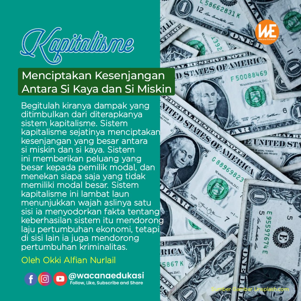 Begitulah kiranya dampak yang ditimbulkan dari diterapkanya sistem kapitalisme. Sistem kapitalisme sejatinya menciptakan kesenjangan yang besar antara si miskin dan si kaya. Sistem ini memberikan peluang yang besar kepada pemilik modal, dan menekan siapa saja yang tidak memiliki modal besar. Dan juga sistem kapitalisme ini lambat laun menunjukkan wajah aslinya satu sisi ia menyodorkan fakta tentang keberhasilan sistem itu mendorong laju pertumbuhan ekonomi, tetapi di sisi lain ia juga mendorong pertumbuhan kriminalitas. Terlihat dari sangat tingginya tingkat kriminalitas yang terjadi sekarang apalagi di kota-kota besar.