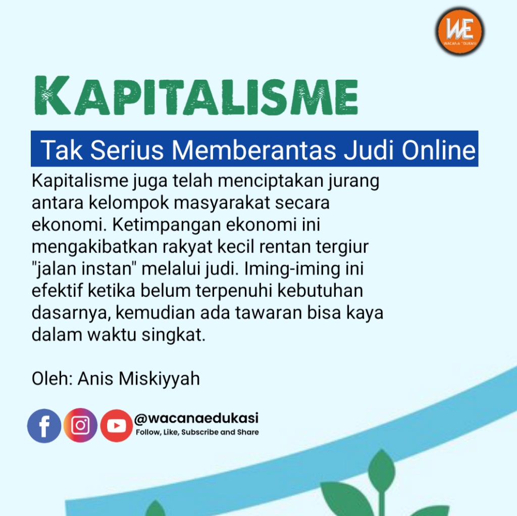 Kapitalisme juga telah menciptakan jurang antara kelompok masyarakat secara ekonomi. Ketimpangan ekonomi ini mengakibatkan rakyat kecil rentan tergiur “jalan instan” melalui judi. Iming-iming ini efektif ketika belum terpenuhi kebutuhan dasarnya, kemudian ada tawaran bisa kaya dalam waktu singkat.