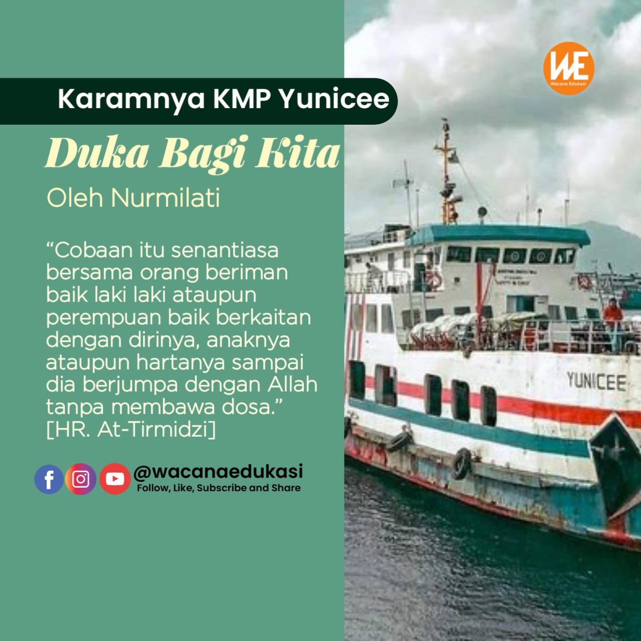 Wacana-edukaai.com –Kabar tenggelamnya Kapal Motor Penumpang (KMP) Yunicee di Selat Bali, sontak mengagetkan sebagian masyarakat terlebih anggota keluarga penumpang dan awak kapal nahas tersebut sehingga mereka diselimuti kesedihan. Betapa tidak, peristiwa ini terjadi di tengah berita menggilanya wabah Covid-19 di Indonesia disertai jumlah korban yang berjatuhan semakin banyak tidak hanya menyasar masyarakat sipil melainkan nakes pun mulai banyak yang terpapar dan berguguran.