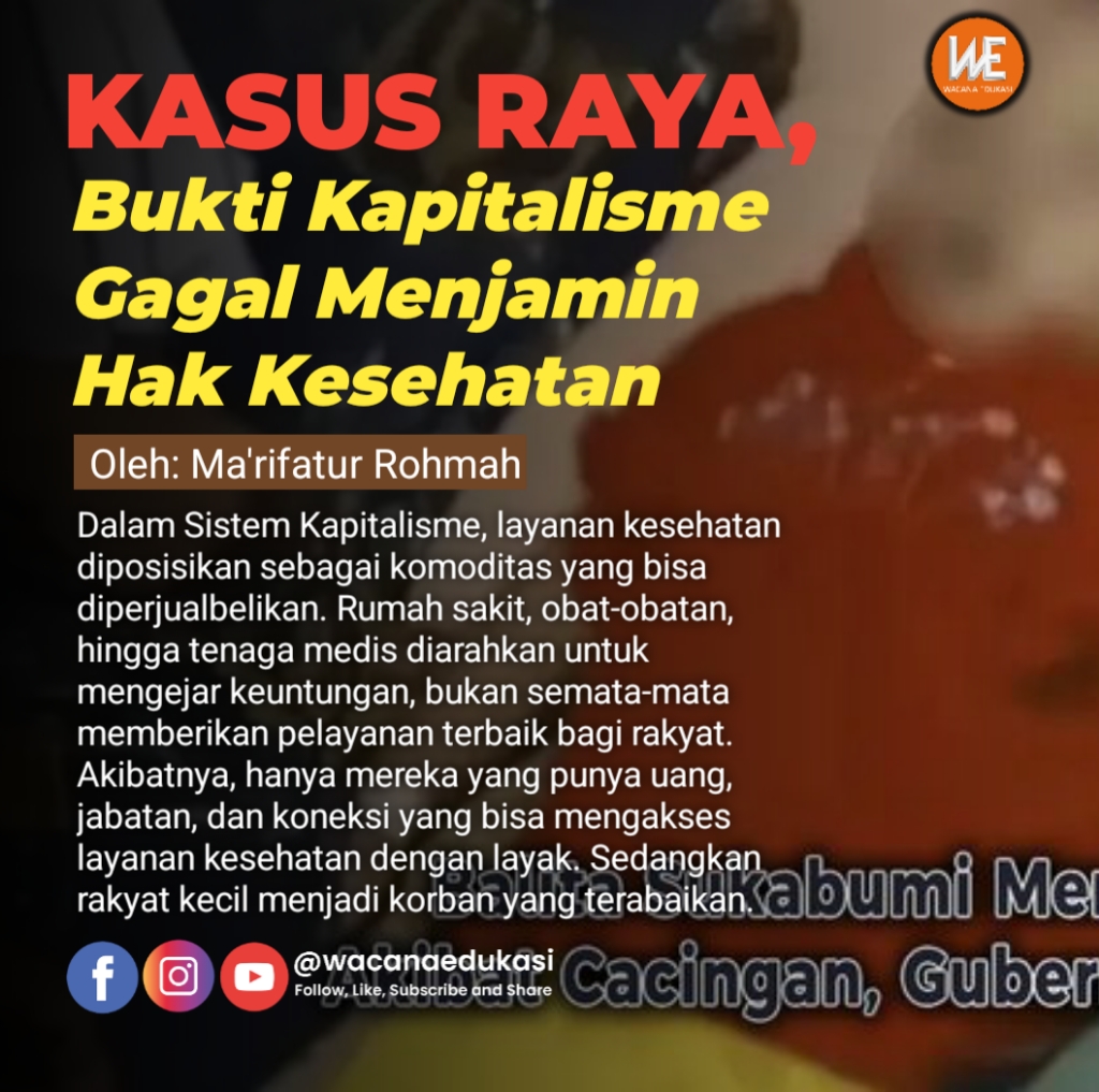 Dalam Sistem Kapitalisme, layanan kesehatan diposisikan sebagai komoditas yang bisa diperjualbelikan. Rumah sakit, obat-obatan, hingga tenaga medis diarahkan untuk mengejar keuntungan, bukan semata-mata memberikan pelayanan terbaik bagi rakyat. Akibatnya, hanya mereka yang punya uang, jabatan, dan koneksi yang bisa mengakses layanan kesehatan dengan layak. Sedangkan rakyat kecil menjadi korban yang terabaikan.