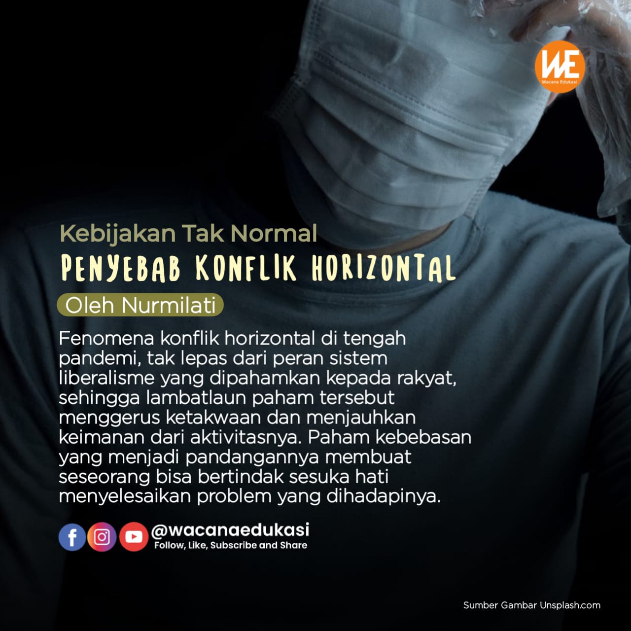 Fenomena konflik horizontal di tengah pandemi, tak lepas dari peran sistem liberalisme yang dipahamkan kepada rakyat, sehingga lambatlaun paham tersebut menggerus ketakwaan dan menjauhkan keimanan dari aktivitasnya. Paham kebebasan yang menjadi pandangannya membuat seseorang bisa bertindak sesuka hati menyelesaikan problem yang dihadapinya. Maka dari sistem inilah yang menjadi akar masalah munculnya berbagai perilaku negatif, pasalnya sekulerisme liberalisme sejak awal menolak campur tangan agama, sehingga dalam pemecahan berbagai permasalahan diukur sesuai hawa nafsu manusia bukan berdasarkan agama, yakni Islam.