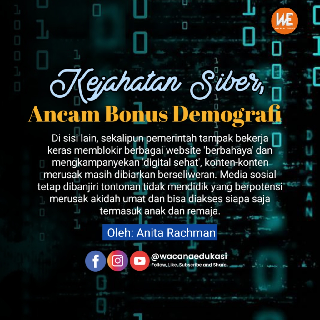 Walhasil, bonus demografi terancam kejahatan siber tidak terelakkan lagi. Mereka menjadi generasi yang lemah, rapuh, mudah terpuruk, hidup galau kosong tanpa visi. Padahal mereka adalah potensi emas penerus generasi dan pembentuk peradaban. Inilah hasil penggunaan teknologi tanpa ilmu dan iman, sebuah konsekuensi dari menerapkan sistem sekuler kapitalisme.