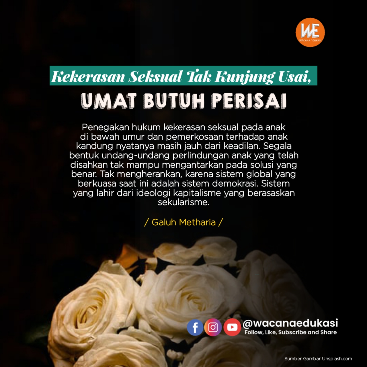 Kasus kekerasan, pelecehan, pemerkosaan atau perzinahan di Indonesia merupakan salah satu indikator kurangnya kualitas perlindungan anak. Maraknya kasus ini menunjukkan adanya kegagalan sistemis dalam sistem kapitalisme sekuler. Untuk itu kita butuh sistem lain yang bisa memberikan perlindungan, penjagaan, mengayomi dan meminimalkan kasus kekerasaan seksual khususnya pada anak.